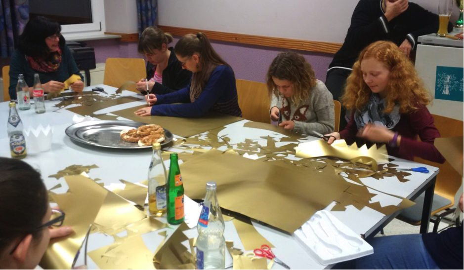 Für das Motto „Royal in Concert“ am Samstag, 21. November 2015 wurde durch das Deko-Team das gesamte Blasorchester dazu eingesetzt, goldene Dekorationsobjekte zu gestalten. Nach Vorlage und mit viel Einsatz und Spaß wurde am vergangenen Mittwoch im Anschluss an die konzertvorbereitende Probe die Produktion der „königlichen Insignien“ bis beinahe Mitternacht betrieben. Scheren, Messer und Bleistifte bewegten sich wie im Takt der Musikstücke. Auch, wenn auf dem Bild nur fleißige Damen, aber keine Männer zu sehen sind: Selbst die haben geholfen!