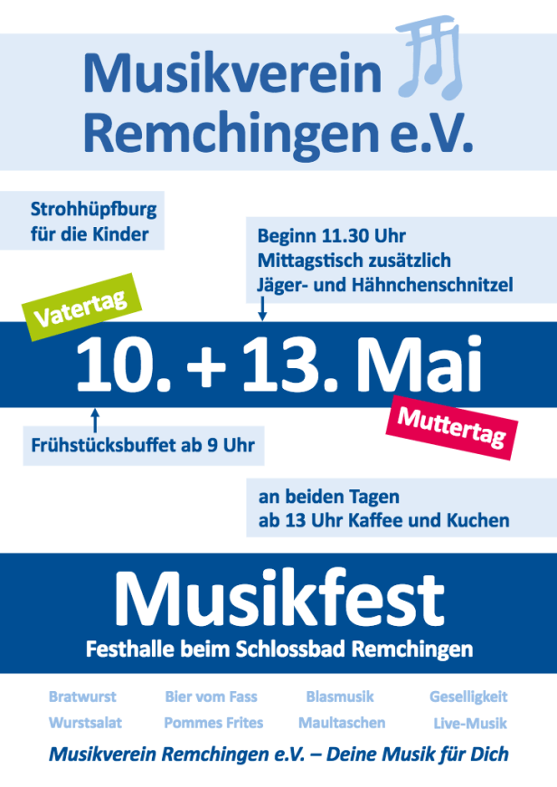 An Christi Himmelfahrt ist das Große Blasorchester des Musikverein Bilfingen zu Gast beim Musikverein Remchingen. Dieser feiert traditionell sein Musikfest in der Turnhalle des FC Alemannia Remchingen (hinterm Freibad Wilferdingen, Buchwaldwiesen 1, 75196 Remchingen) .