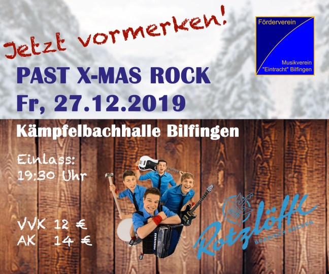 Das Jahr neigt sich so langsam dem Ende zu und wir präsentieren zum Jahresabschluss wie gewohnt unseren PAST X-MAS ROCK. Dieses Jahr ist es uns gelungen die bekannten „Rotzlöffl“ zu verpflichten und ihr dürft euch auf einen standesgemäßen Party-Abend freuen.