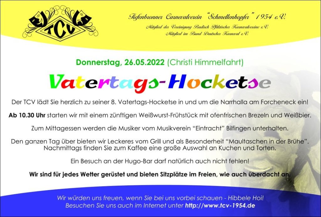 Beim Tiefenbronner Carnevalsverein „Schmellenhopfer“ dürfen wir wie bereits 2019 für die passende musikalische Unterhaltung zur traditionellen Vatertags-Hocketse sorgen. Daneben warten viele kulinarische Spezialitäten auf die Gäste.