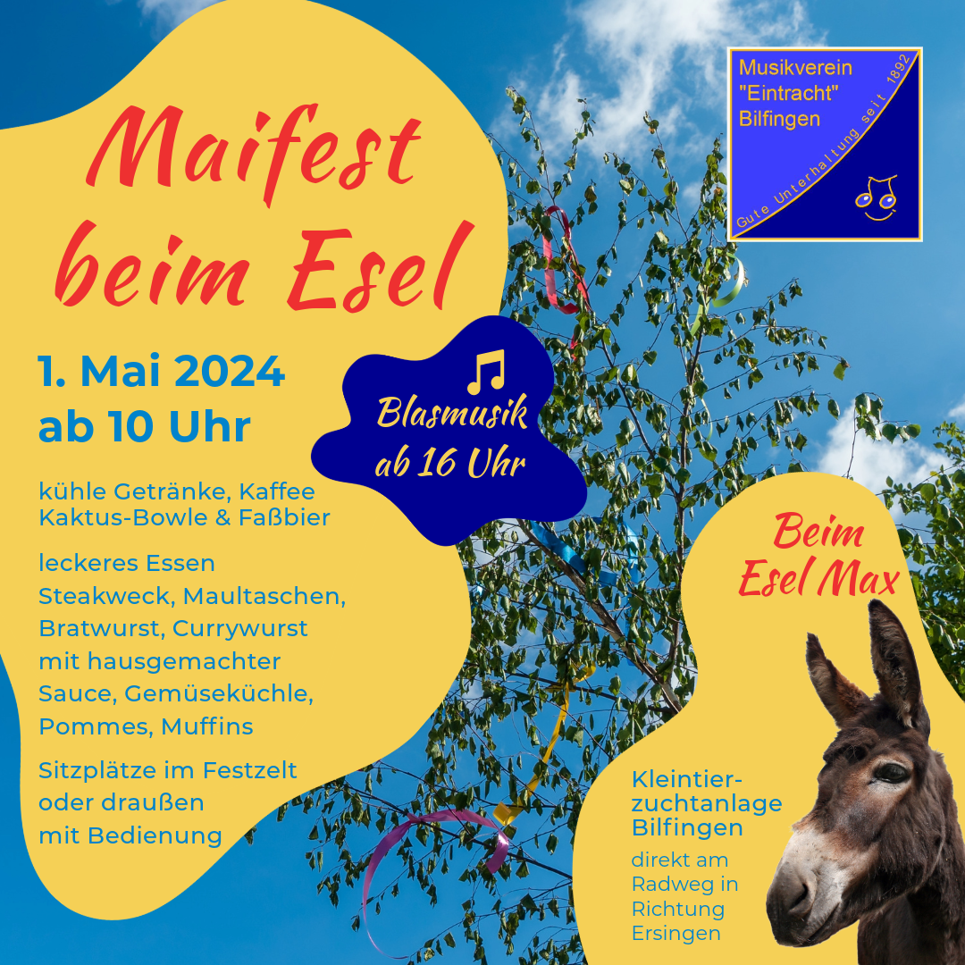 Auch in diesem Jahr lädt der Musikverein „Eintracht“ Bilfingen wieder ein zum traditionellen Maifest in der Kleintierzuchtanlage Bilfingen. Für Speis und Trank ist wie immer vor Ort bestens gesorgt. Es gibt Bratwurst ubd Steak vom Grill im Brötchen, Maultaschenweck mit geschmälzten Zwiebeln und gebratene Gemüseküchle mit Quark-Dip ebenfalls im Weck. Pommes und Muffins dürfen natürlich auch nicht fehlen. An der Theke gibt es Fassbier, Wein und alkoholfreie Getränke, unsere allseits beliebte Kaktus-Bowle wird ebenfalls wieder angeboten. Falls das Wetter nicht mitspielen sollte, gibt es auch überdachte Sitzplätze, natürlich gibt es auch Plätze im Freien.