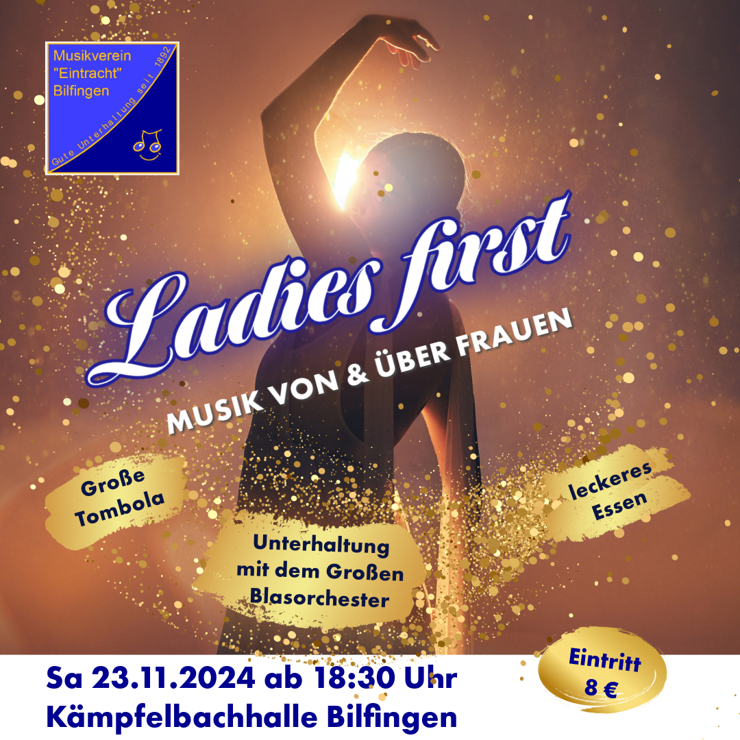 Der Musikverein „Eintracht“ Bilfingen lädt alle Freunde der Musik zum diesjährigen Herbstkonzert am 23.11.2024 in die Kämpfelbachhalle zu Bilfingen ein. Unter dem Motto „Ladies First – Musik von und über Frauen“ präsentiert das große Blasorchester unter der Leitung von Alexander Meixner eine bunte Mischung aus verschiedenen Musikgenres. Von klassischer Musik bis Rock-Pop ist alles dabei, alles natürlich rund um das Thema Frauen in der Musikwelt. Saalöffnung ist 18:30 Uhr, das Konzert beginnt um 19:30 Uhr.