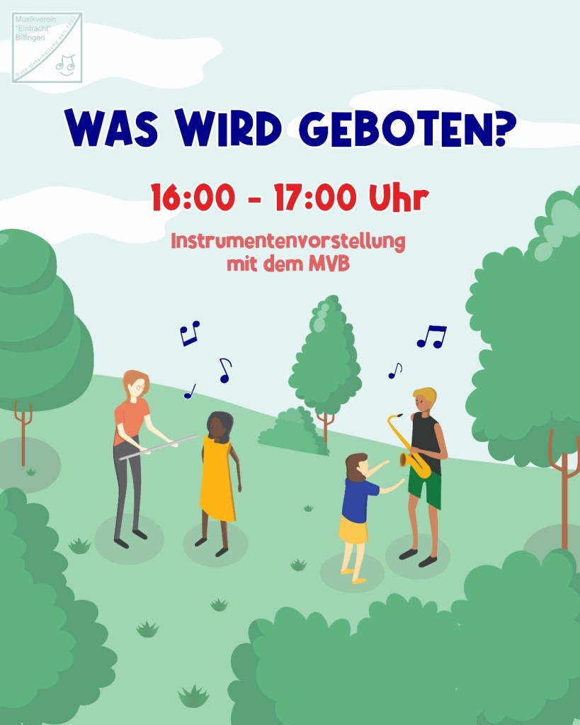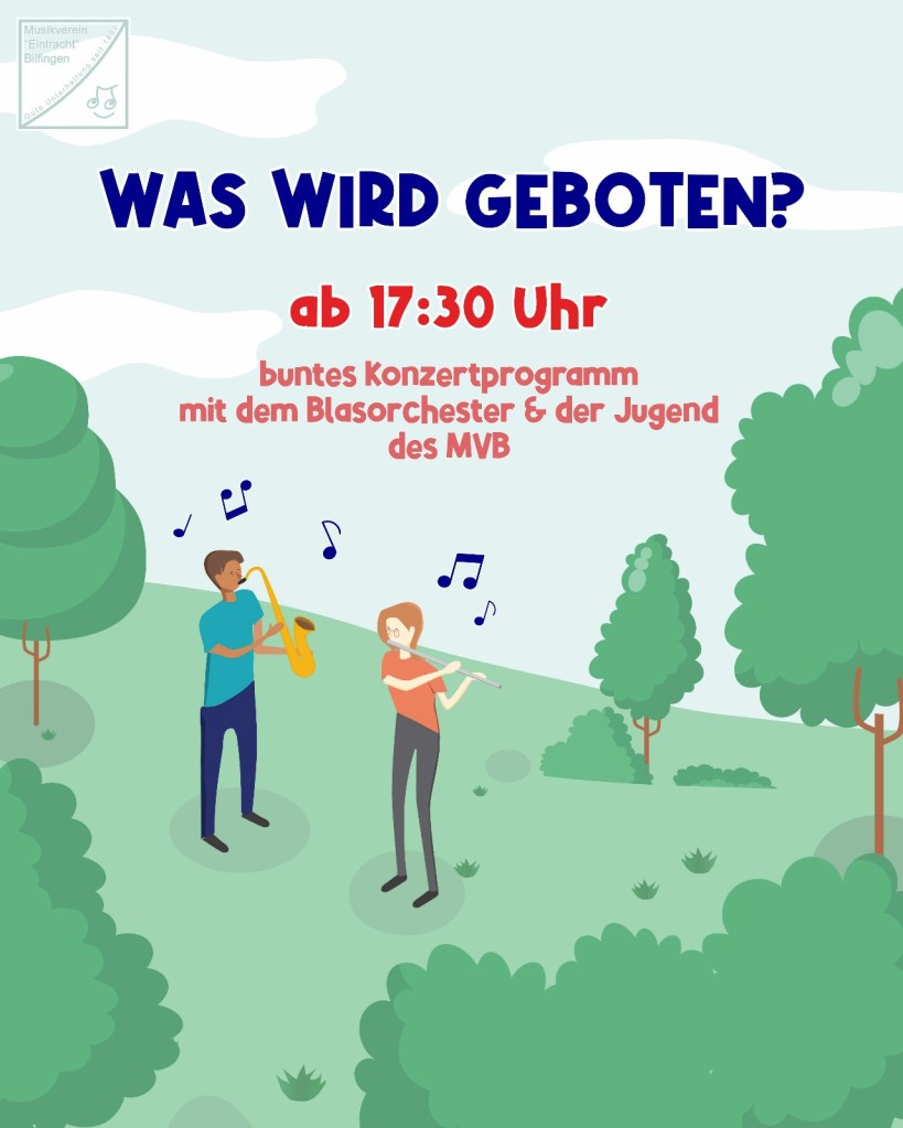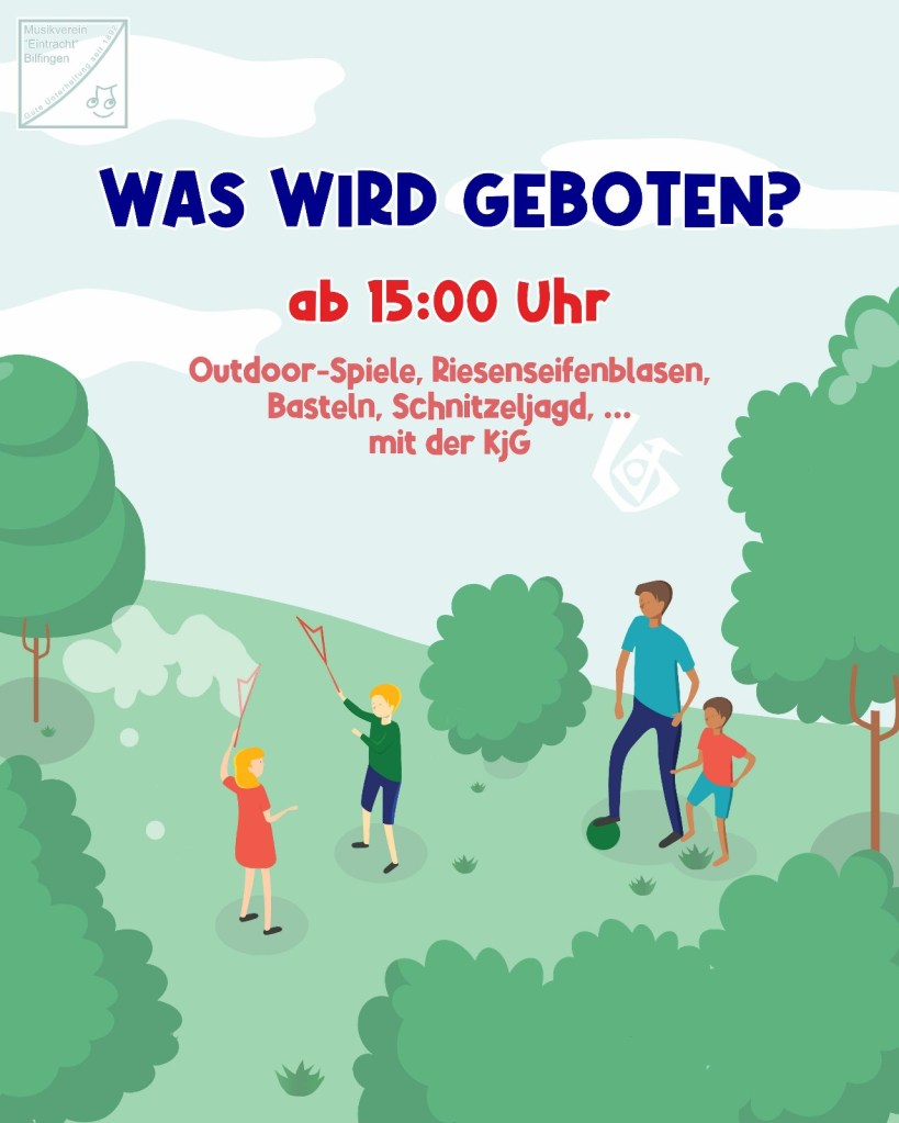- WAS? ab 15:00 Uhr Outdoor-Spiele, Basteln, Schnitzeljagd mit der KjG, Instrumentenvorstellung mit dem MVB und ab 17:30 Uhr buntes Konzertprogramm mit dem Blasorchester und der Jugend des MVB