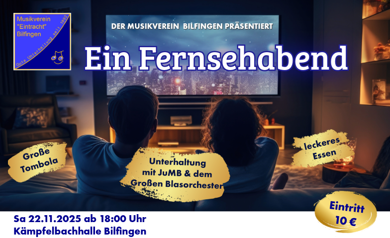 Der Musikverein „Eintracht“ Bilfingen lädt zum diesjährigen Herbstkonzert am 22.11.2025 in der Kämpfelbachhalle Bilfingen ein. Unter dem Motto „Ein Fernsehabend“ präsentiert das Jugendorchester und das große Blasorchester, bekannte Titel und Melodien aus dem Fernsehprogramm der letzten Jahrzehnte. Karten gibt es im Vorverkauf beim s´Bilfinger Kiosk in der Hauptstraße oder online bei Eventfrog unter https://eventfrog.de/fernsehabend-mvb zu finden auf unserer Homepage. Restkarten gibt es dann an der Abendkasse, Kartenpreis liegt bei 10,00 Euro.