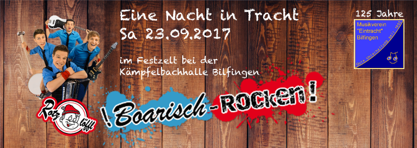 Alle Fans des Oktoberfestes oder Canstatter Wasens aufgepasst, der Musikverein „Eintracht“ Bilfingen bringt anlässlich seines 125jährigen Jubiläums mit den Rotzlöffl vier waschechte Bayern ins große Festzelt bei der Kämpfelbachhalle Bilfingen.