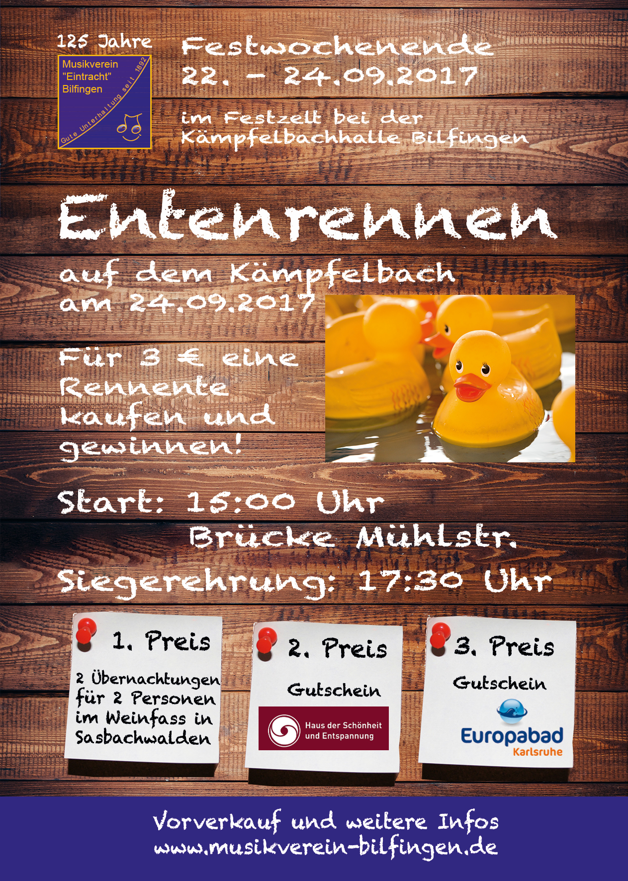 Im Rahmen des Festwochenendes vom 22.-24. September 2017 wird am Sonntag, 24. September das 1. Bilfinger Entenrennen auf dem Kämpfelbach stattfinden.