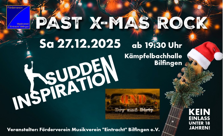 Der Förderverein des Musikvereins Eintracht Bilfingen e.V. lädt ein zum Past X‑Mas Rock — der Party nach den Feiertagen zum Feiern, Mitsingen und Abtanzen. Freu dich auf zwei erstklassige Live‑Acts, großartige Stimmung und einen Abend, bei dem die Tanzfläche nie leer bleibt.